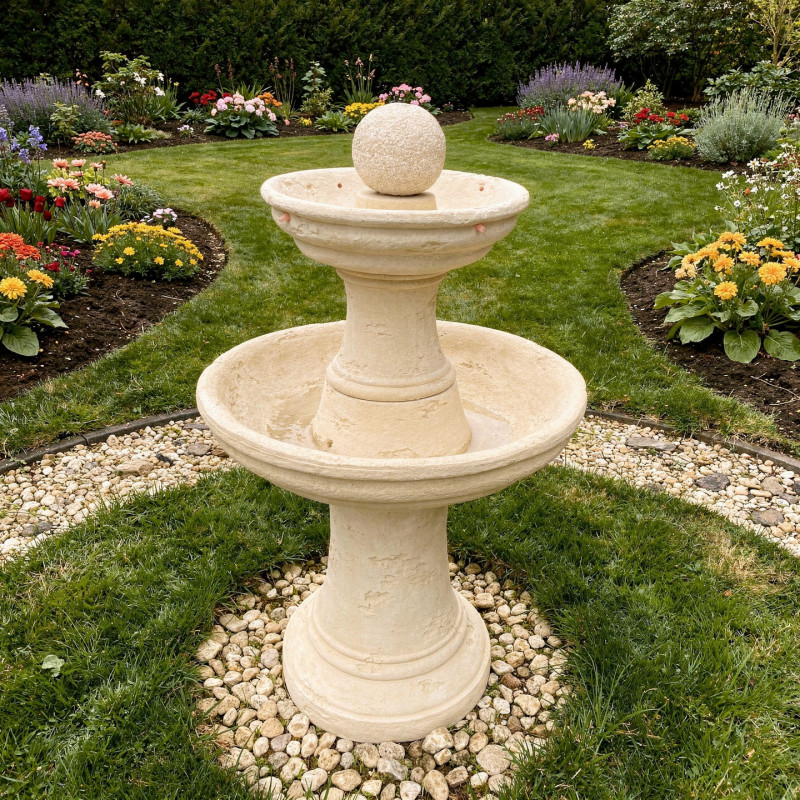 Fontána je včetně čerpadla, které honí vodu v koloběhu se spodní mísy do koule a padá několika pramínky zpět dolů.