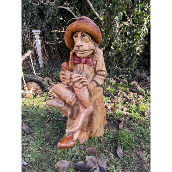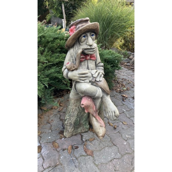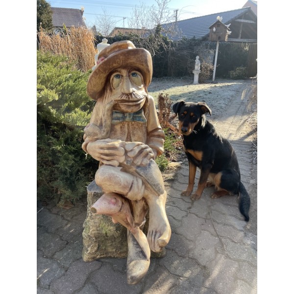 Nie je to len dekorácia. Je to stredobod vašej záhrady. Vodník Mel sedí na detailne prepracovanom pni, v rukách drží rybu, ktorá po napojení na vodné čerpadlo funguje ako plnohodnotný chrlič. Voda elegantne vyteká z úst ryby priamo do vášho jazierka a vytvára ukľudňujúci zvuk zurčenia, ktorý premení vašu záhradu na oázu pokoja.